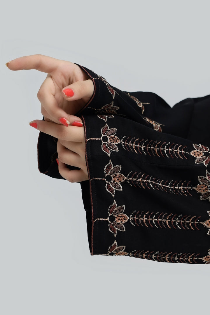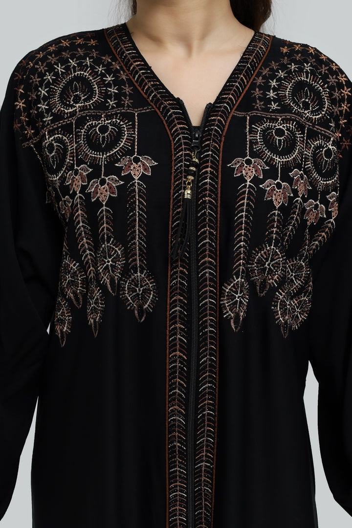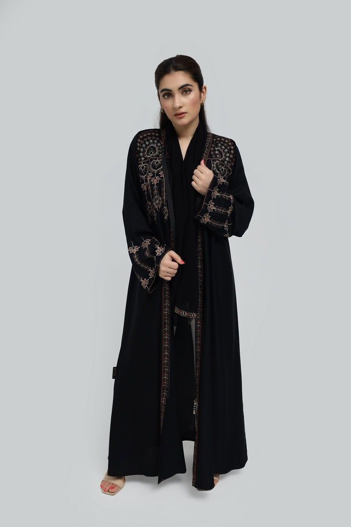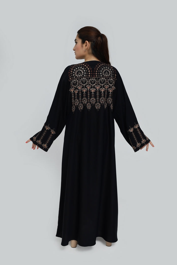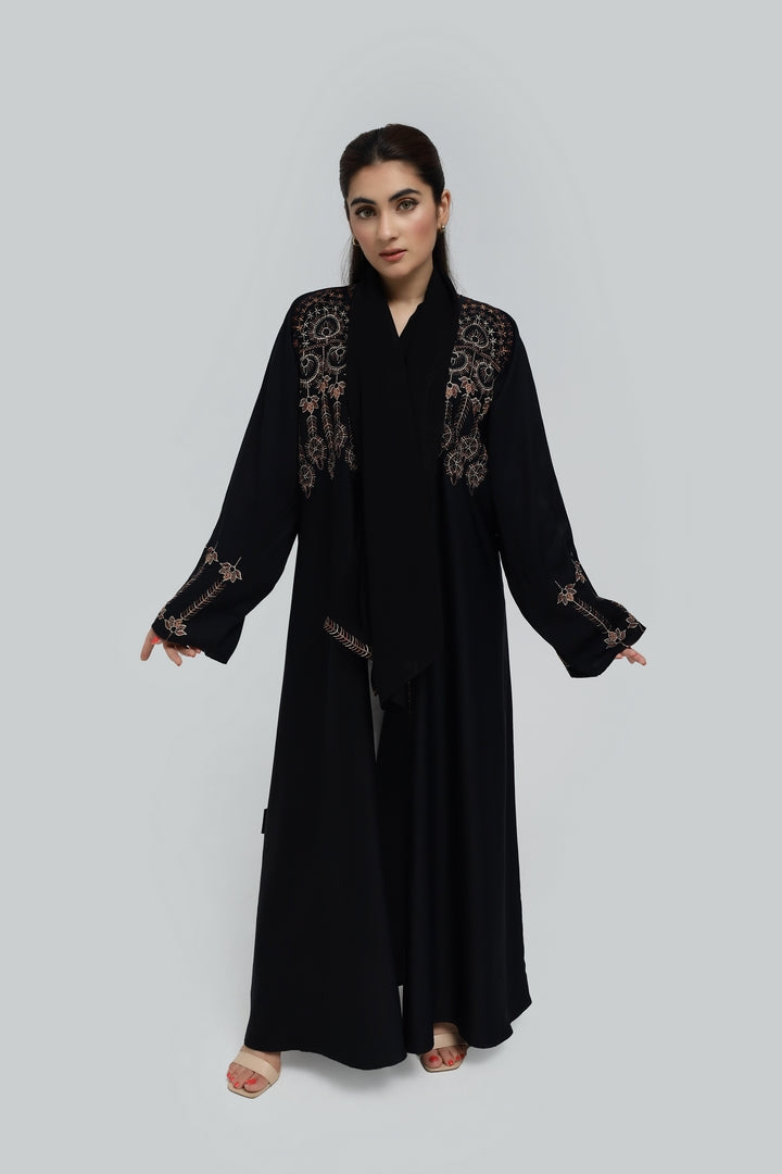With its bold detailing and flowing presence, Rania captures the drama and delicacy of botanical artistry. The front opening is lined with elegant rose-gold vine embroidery from neckline to hem, while the back blooms into a stunning full-panel motif that leaves a lasting impression. Crafted from premium Saudi Nida fabric, Rania balances softness and structure in a silhouette made to move with grace.
